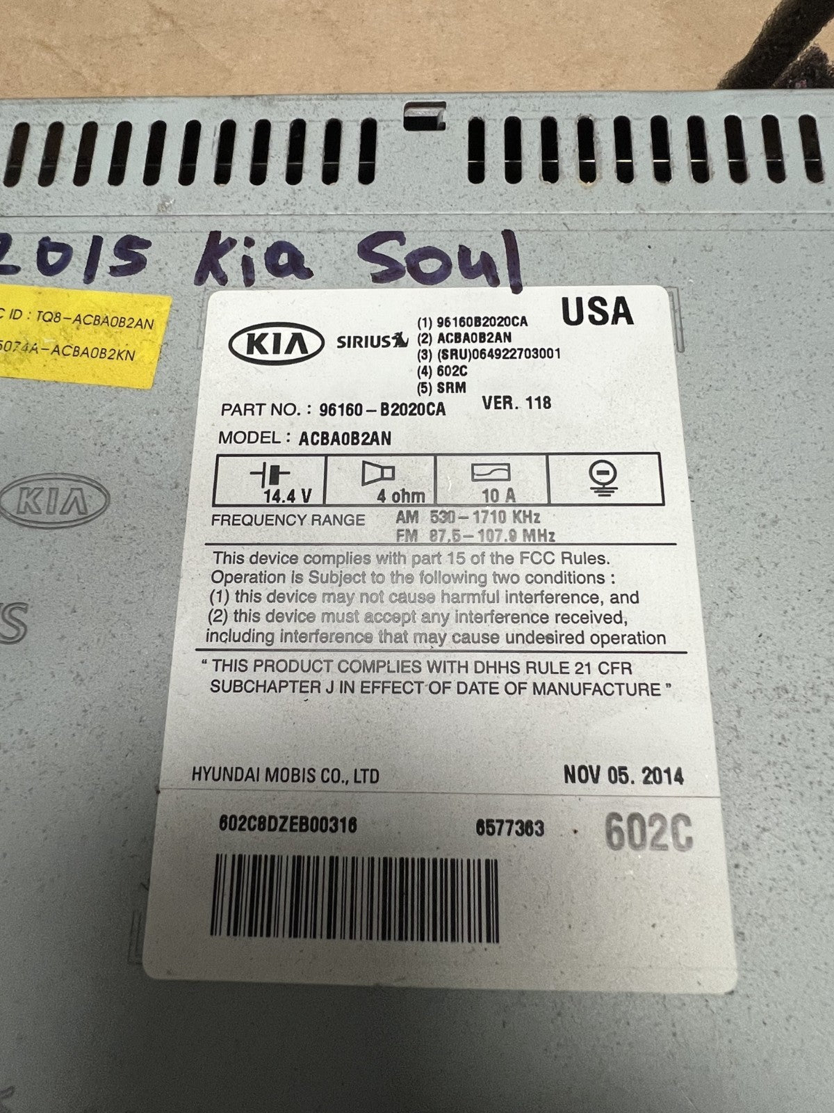 2014 2015 2016 Kia Soul AM FM CD Player Radio Receiver OEM 96160 B2020CA
